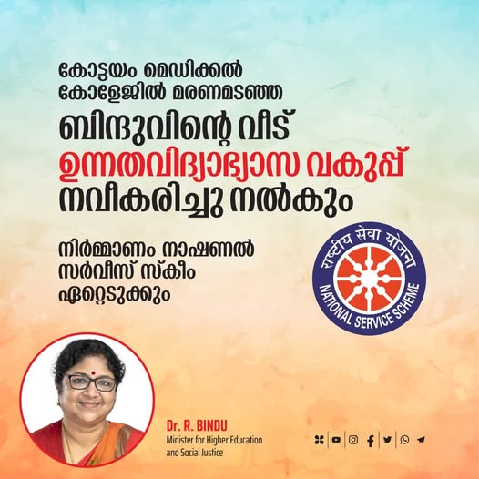 കോട്ടയം മെഡിക്കൽ കോളേജിൽ മരണമടഞ്ഞ ബിന്ദുവിൻ്റെ വീട് ഉന്നതവിദ്യാഭ്യാസ വകുപ്പിനു കീഴിലുള്ള നാഷണൽ സർവീസ് സ്കീം ആഭിമുഖ്യത്തിൽ നവീകരിച്ചു നൽകുമെന്ന് ഉന്നതവിദ്യാഭ്യാസ-സാമൂഹ്യനീതി മന്ത്രി ഡോ. ആർ ബിന്ദു അവരുടെ കുടുംബത്തെ അറിയിച്ചു. ബിന്ദുവിൻ്റെ ഭർത്താവ് വിശ്രുതനെയും അമ്മ സീതമ്മയെയും ഫോണിൽ വിളിച്ചാണ് മന്ത്രി ഡോ. ബിന്ദു ഇക്കാര്യം അറിയിച്ചത്.